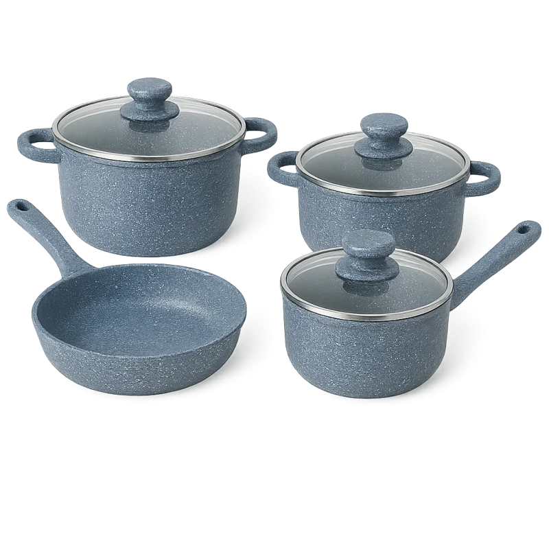 BLUE GRANITE – GR-411 is a functional and stylish cookware set that adds warmth to your kitchen with its elegant pink and natural granite texture. Its advanced granite coating provides maximum scratch resistance and maintains its original appearance for a long time.