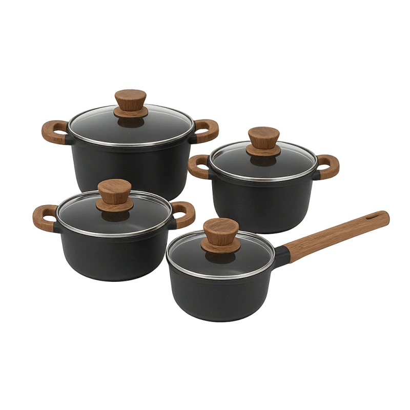 NERO GRANITE – GR-308 is an eight-piece black granite cookware set that adds elegance to your kitchen while offering a healthy cooking experience. Its matte black granite texture and scratch and abrasion resistance ensure long-lasting use. Its five-layer special granite coating makes the surface extremely non-stick, allowing you to cook with minimal oil and clean easily.