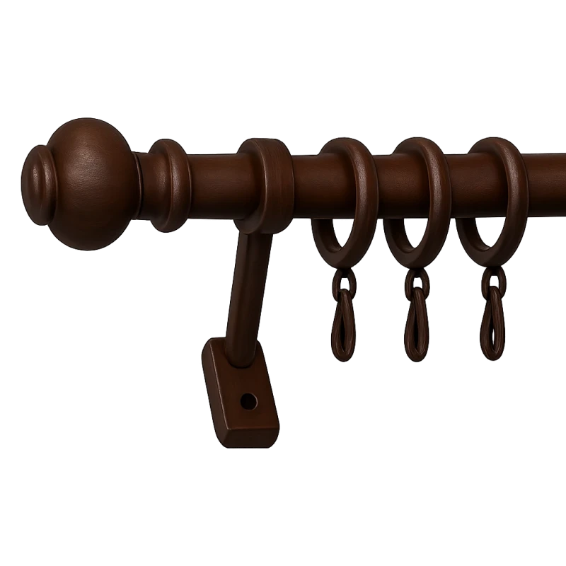 DARK WALNUT – RA-108 elegantly complements living spaces by combining the warmth of natural wood with the nobility of dark walnut. Its intensely pigmented dark brown tones create a strong contrast in both curtains and tulle combinations. The matte varnish coating protects the surface and highlights the natural wood grain. The handcrafted detailing on the ends and body shape highlights classic decorations while adding a nostalgic atmosphere. It is particularly well-suited for spaces with wooden furniture, country-style décor, or traditional decor. Its robust construction allows for safe use with heavy curtains. Mounting hardware is included.