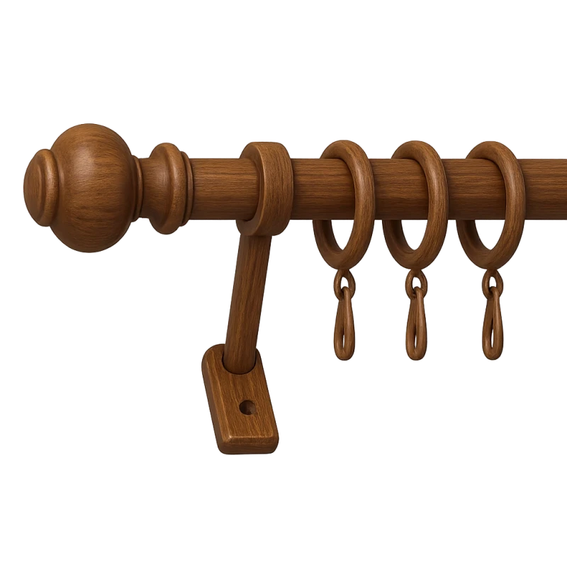NATURA WALNUT – RA-101 adds rustic elegance to any interior design with its warm walnut tones and natural wood texture. Elegant knob-end details combine classic and modern lines, while its sturdy metal structure ensures long-lasting use. Its matte finish doesn't reflect light, creating a natural look. It's a complementary accessory to rustic, country, or bohemian decor in living rooms, dining rooms, or bedrooms. It's compatible with both tulle and thick fabric curtains. It's available as a complete set, including wall mounting brackets.